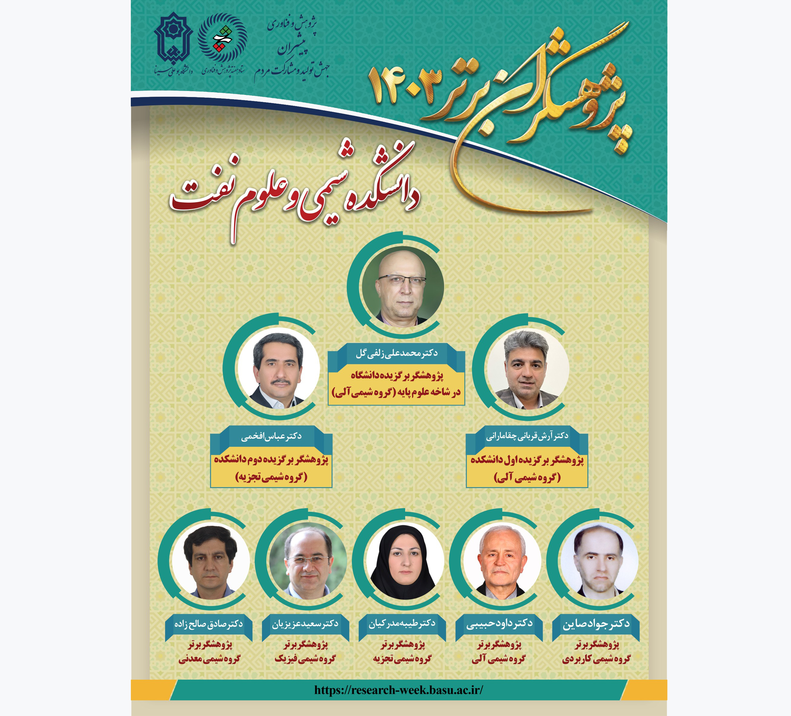 به مناسبت هفته پژوهش و فناوری، پژوهشگران برتر دانشکده‌ شیمی و علوم نفت دانشگاه بوعلی سینا انتخاب و معرفی شدند. این انتخاب بر اساس معیارهای علمی، مقالات پژوهشی، فعالیت‌های فناورانه و دستاوردهای برجسته در حوزه‌های مختلف علمی صورت گرفته است.