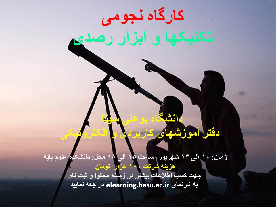 کارگاه نجومی تکنیکها و ابزارهای نجومی در تاریخهای 10 الی 13 شهریور 97 ساعت 15 الی 18 در محل دانشکده علوم پایه برگزار میگردد.