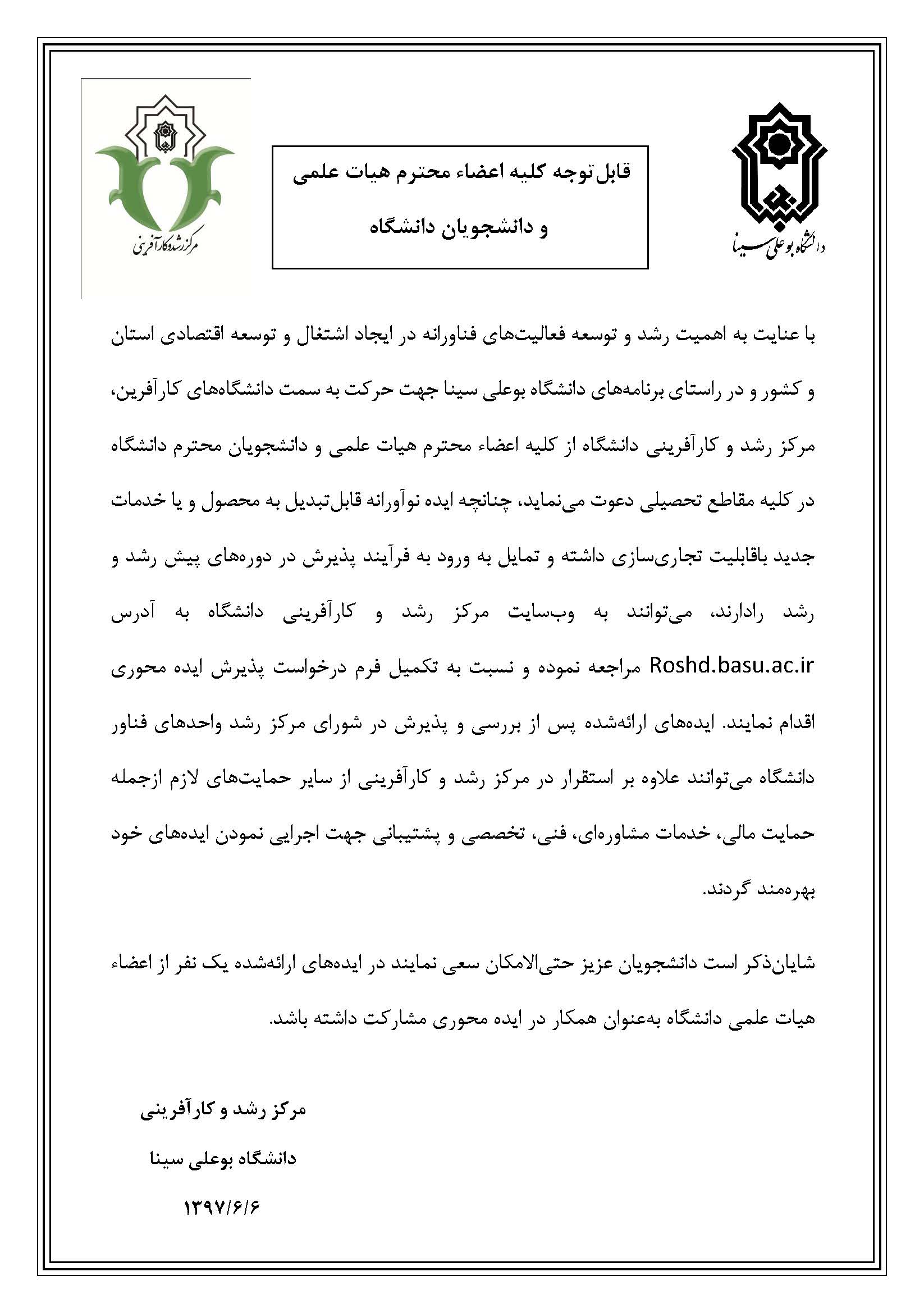 از کلیه اعضاء محترم هیات علمی و دانشجویان محترم دانشگاه در کلیه مقاطع تحصیلی ، چنانچه ایده نوآورانه قابلتبدیل به محصول و یا خدمات جدید باقابلیت تجاریسازی داشته و تمایل به ورود به فرآیند پذیرش در...