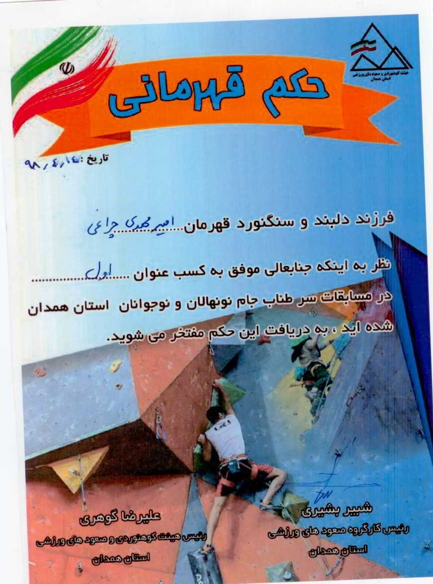 کسب عنوان قهرمانی مسابقات سنگنوردی استان همدان توسط امیر مهدی چراغی روشن