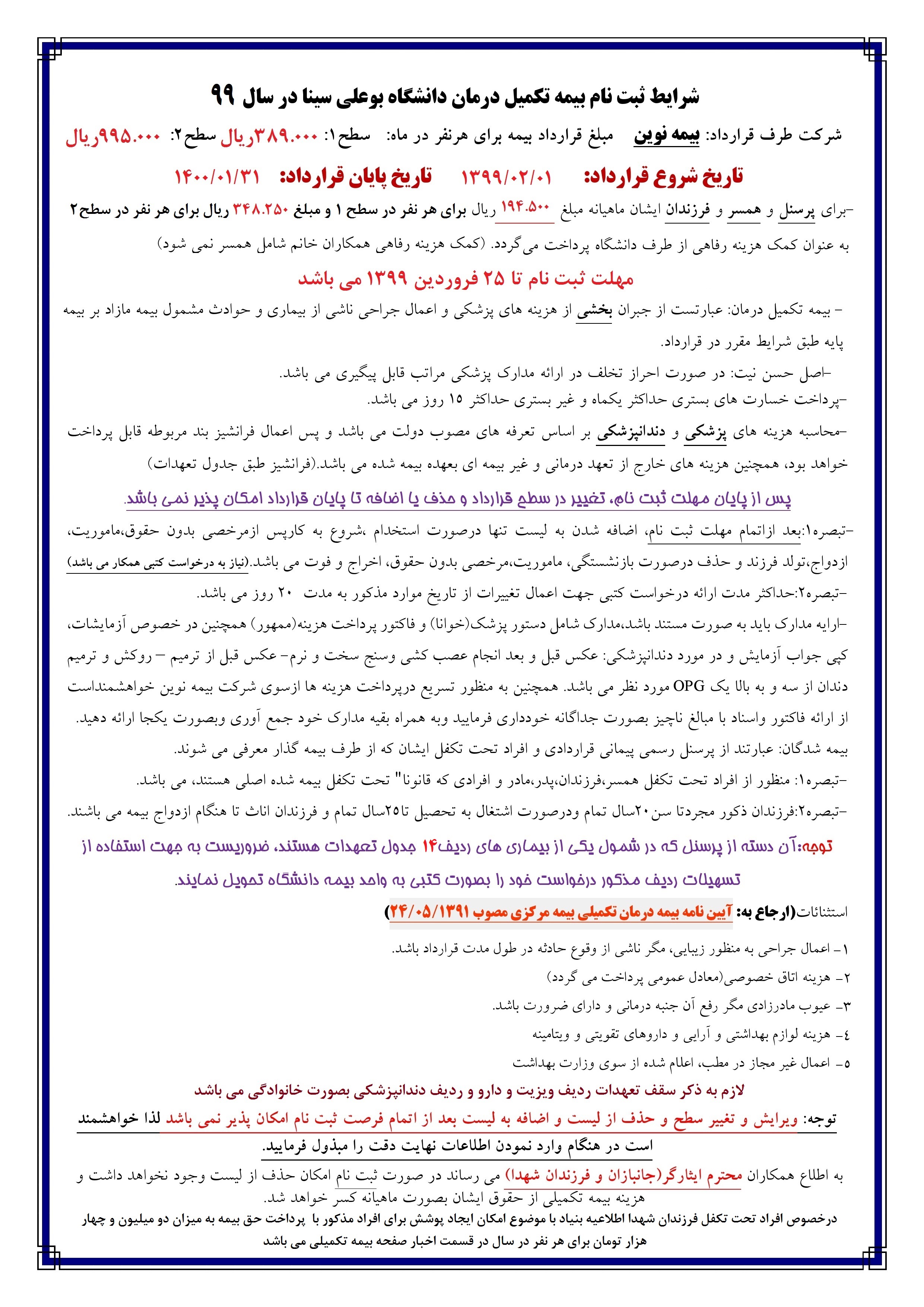اطلاعیه ثبت نام بیمه تکمیلی سال 1399 دانشگاه - دانشگاه بوعلی سینا همدان