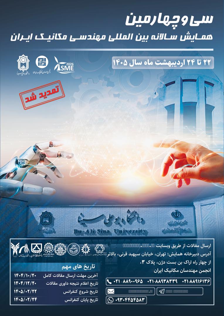 دانشگاه بوعلیسینا – همدان با افتخار اعلام میکند که سیوچهارمین کنفرانس بینالمللی مهندسی مکانیک ایران با همکاری انجمن مهندسان مکانیک ایران و با حضور استادان برجسته، پژوهشگران برجسته دانشگاهی، متخصصان صنعت و فعالان حوزه فناوری، در تاریخ ۲۲ تا ۲۴ اردیبهشت ۱۴۰۵ در این دانشگاه برگزار خواهد شد.
