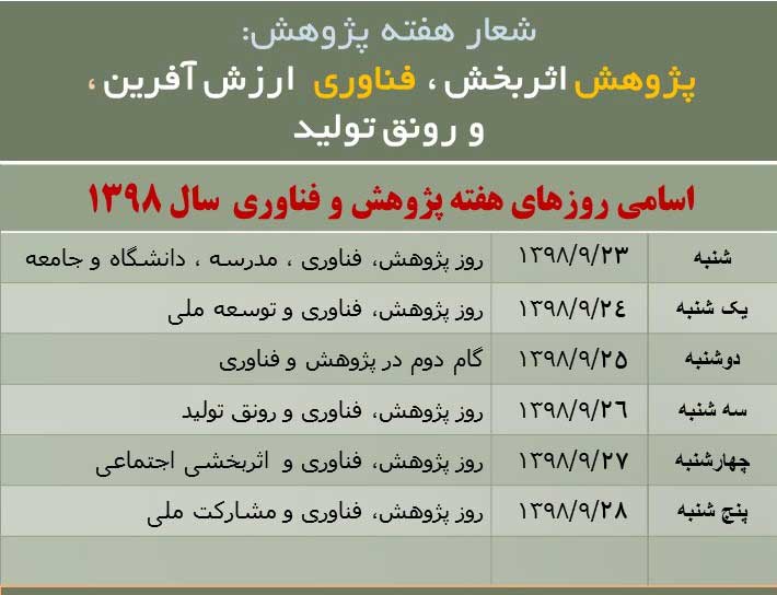 مدیرکل دفتر حمایت و پشتیبانی امور پژوهشی و فناوری وزارت علوم، اظهار داشت: روز چهارشنبه ۲۷ آذرماه مصادف با پنجمین روز هفته پژوهش، به عنوان «پژوهش، فناوری و اثربخشی اجتماعی» انتخاب شده و ۲۸ آذرماه و ششمین روز این هفته با عنوان «پژوهش، فناوری، مشارکت ملی» نامگذاری شده است.