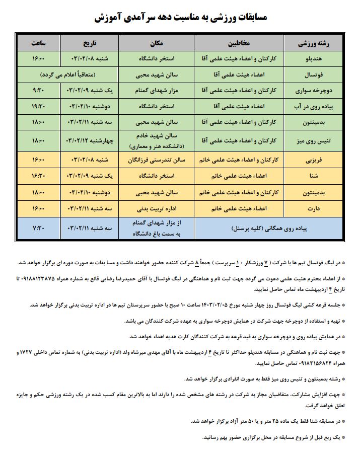 9- برگزاری مسابقات ورزشی خاص آقایان و خانم ها در دو سطح صرفا هیات علمی و هیات علمی و کارکنان با هماهنگی و اجرای مدیریت تربیت بدنی دانشگاه