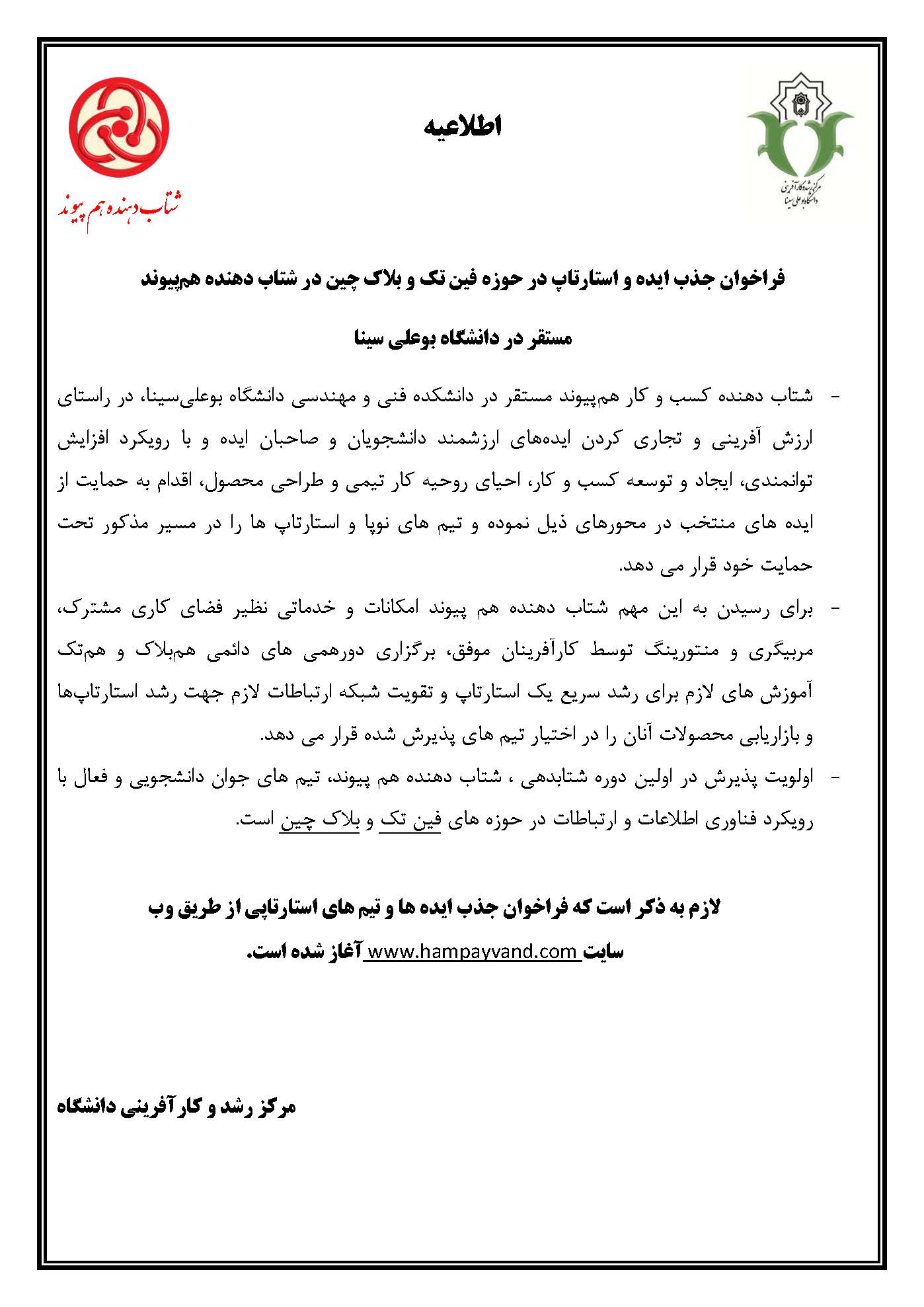 لازم به ذکر است که فراخوان جذب ایده ها و تیم های استارتاپی از طریق وب سایتwww.hampayvand.com آغاز شده است.