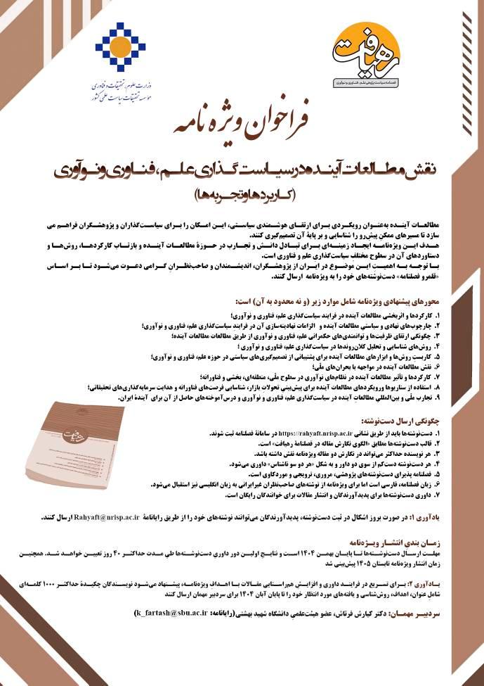 فصلنامه رهیافت به صاحب امتیازی موسسه تحقیقات سیاست علمی کشور در نظر دارد همسو با اهداف و دامنه‌ی موضوعی خود، ویژه نامه‌ای تحت عنوان " نقش مطالعات آینده در سیاست‌گذاری علم، فناوری و نوآوری (کاربردها و تجربه ها)" منتشر نماید. این ویژه‌نامه با هدف ایجاد بستری برای تبادل دانش و تجربیات پژوهشی، بازتاب کارکردها، روش‌ها و دستاوردهای مطالعات آینده در سطوح مختلف سیاست‌گذاری علم و فناوری و ارتقای کیفیت تصمیم گیری‌های علمی و سیاستی برنامه ریزی شده است. محورهای پیشنهادی ویژه‌نامه در فراخوان پیوست شده است.
